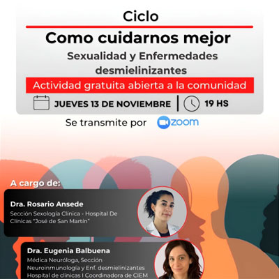 Ponemos a disposición el encuentro Online “Sexualidad y Enfermedades Desmielinizantes”, dirigido a la comunidad, tuvo como disertantes a la Dra. Rosario Ansede (Sección Sexología Clínica, Hospital de Clínicas “José de San Martín) y a la Dra. Eugenia Balbuena (Médica neuróloga, Sección Neuroinmunología y Enfermedades Desmielinizantes, Hospital de Clínicas y Coordinadora del CIEM – UBA)